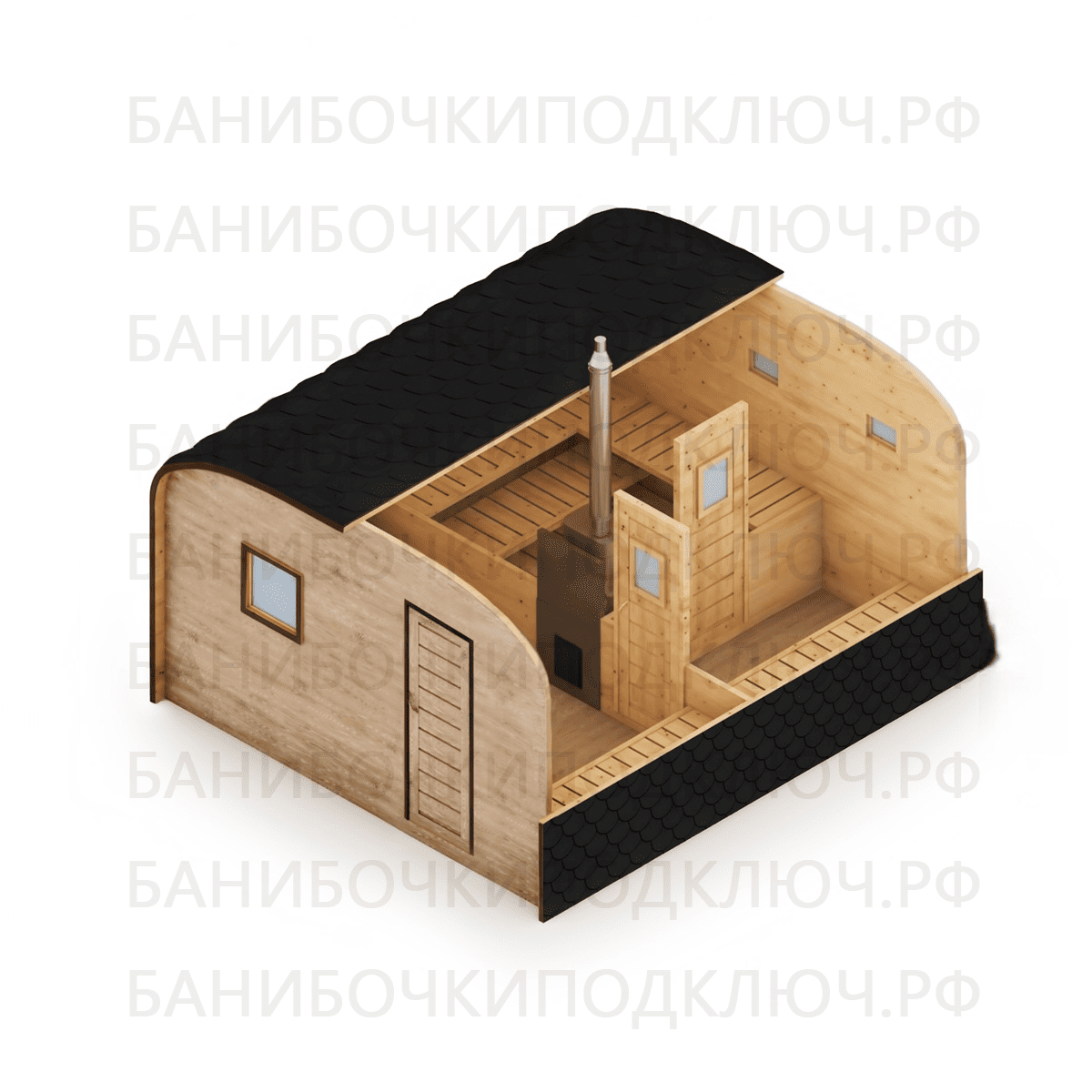 Баня Викинг 6 x 2,2 м с арочным входом и проходной мойкой